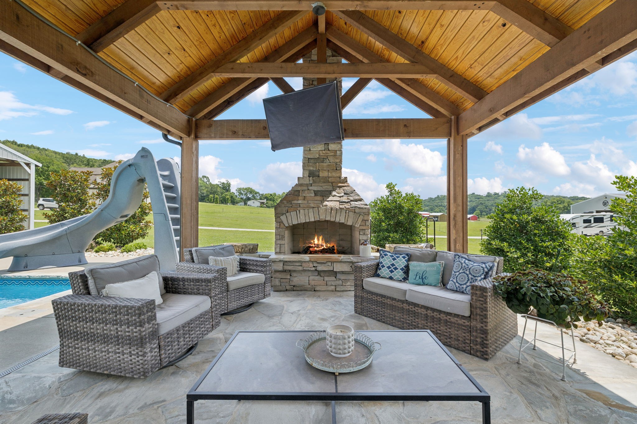 This one checks the boxes! 3 bedrooms with primary bedroom suite downstairs. Primary bath has a large tile shower, separate garden tub and double sink vanity. Primary bedroom also has a large walk- in closet. Office downstairs off the entry foyer, large formal dining room off the entry foyer, eat in kitchen with nook and breakfast bar, vaulted living room with fireplace, half bath down, huge laundry room downstairs, oversized 2 car garage, 2 bedrooms with their own baths upstairs, massive bonus/ rec room with wet bar and half bath upstairs over the garage. Wonderful outdoor living spaces! Screened patio with hot tub that remains. In ground pool with huge gazebo living space that has its own kitchen, wood burning fireplace and wired for entertainment. 5 sprawling acres with countryside views partially fenced for livestock. Large shop building for storing all kinds of toys or use it for a home gym, external bonus/ rec room space or whatever your heart desires. RV/ Camper carport with electric. Half inch hardwood floors that can be refinished if desired, granite counter tops, stainless appliances. A must see! Book your showing tour ASAP! Shown by appointment only.