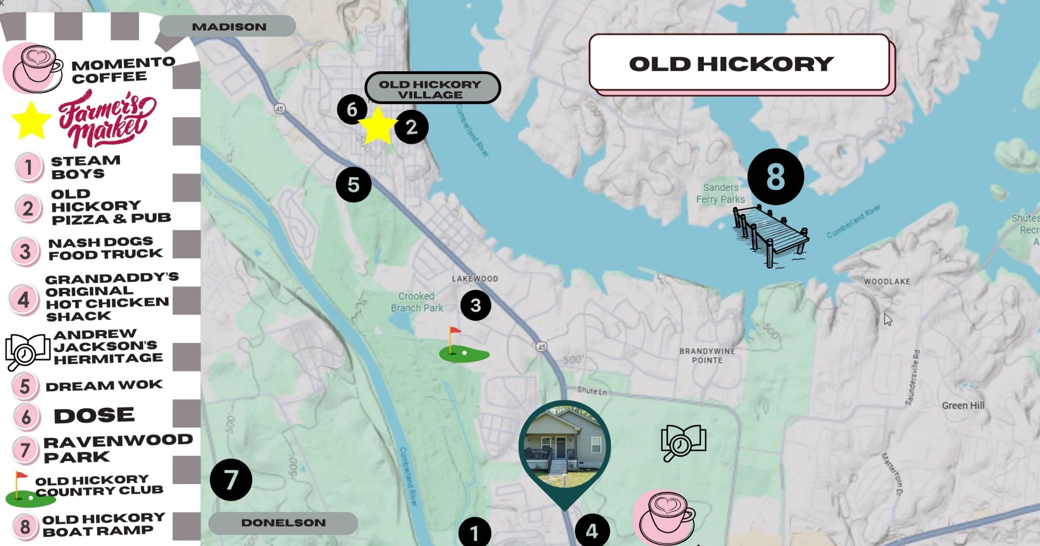 From Nashville,Travel Eastbound on I40,Take exit 221A toward TN-45 N/The Hermitage, Continue onto Old Hickory Blvd 3.8 miles, Turn Right onto 4th Ave just before House, Make first left onto the Alley Way marked "Clown", Parking behind home under carport.