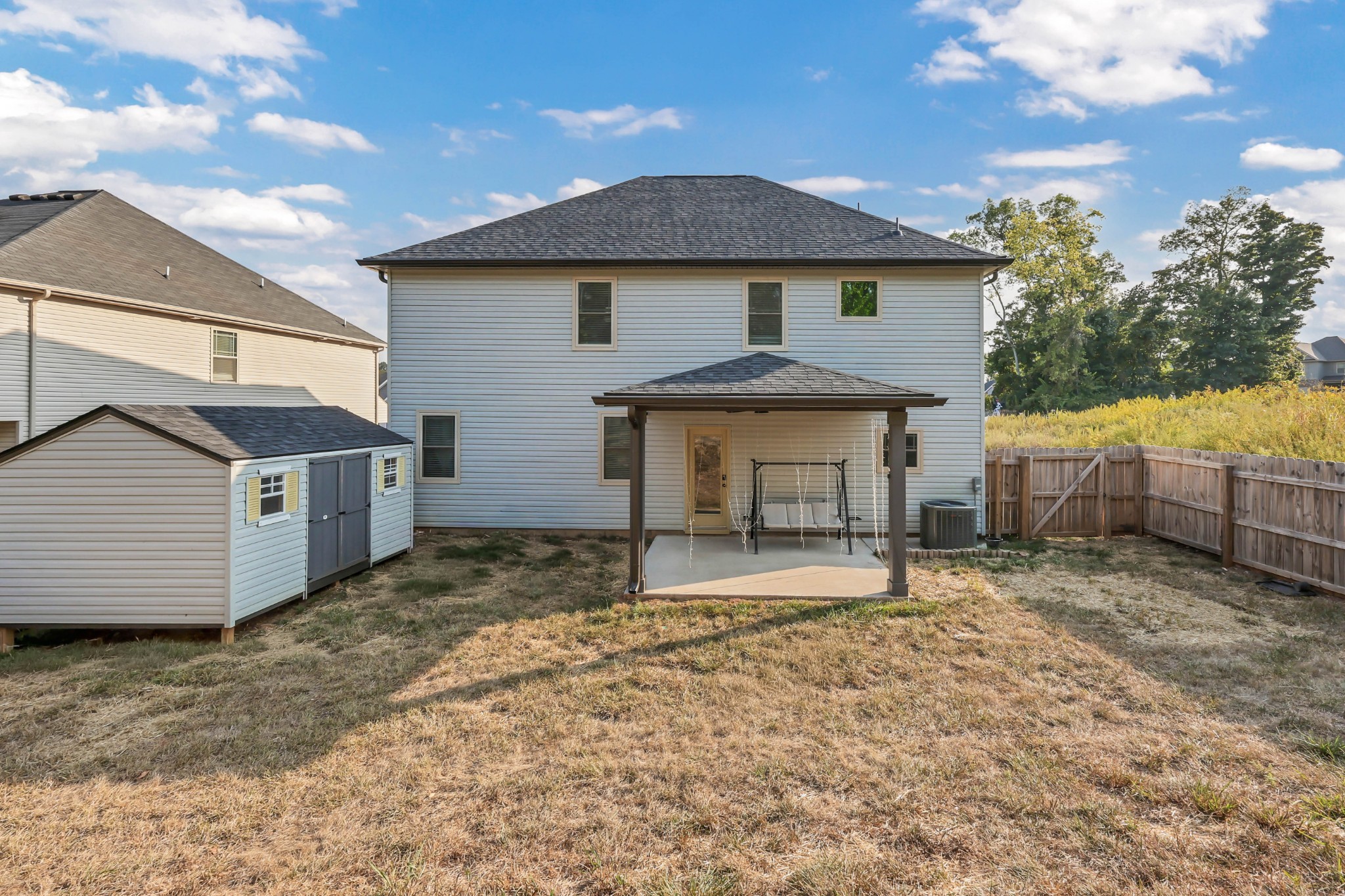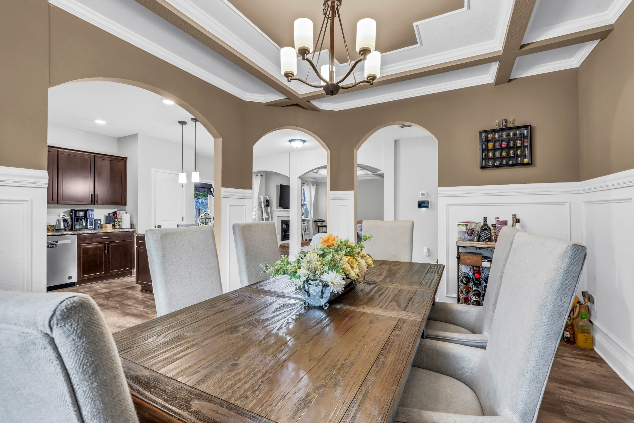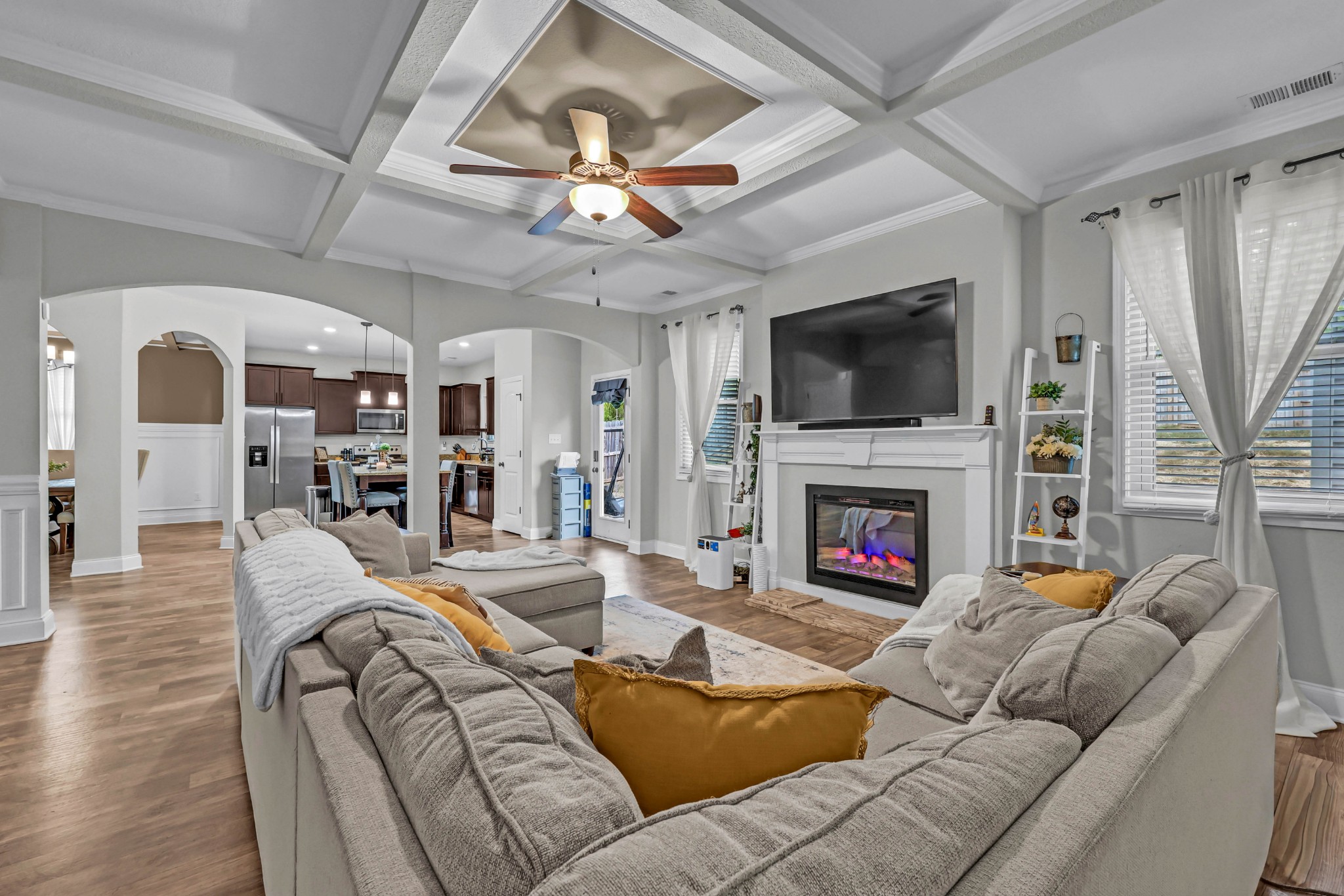 Spacious and beautifully maintained 5- bedroom, 3- bath home in West Creek Farms. This open- concept layout features elegant coffered ceilings, crown molding, wainscoting, and durable wood- look flooring throughout the main areas. The chef’s kitchen includes granite countertops, a 7- ft island, stainless steel appliances, and a walk- in pantry, flowing into a cozy living room with fireplace. A formal dining room adds sophistication, and a main- level bedroom sits near a full bath—ideal for guests or a home office. Upstairs, the expansive owner’s suite offers a private sitting room, two walk- in closets, and a spa- like bath with soaking tub and tiled shower. Enjoy a covered back patio, a fully privacy- fenced yard, and a large storage shed for added convenience. Schedule your tour today and see why this home stands out in West Creek Farms!