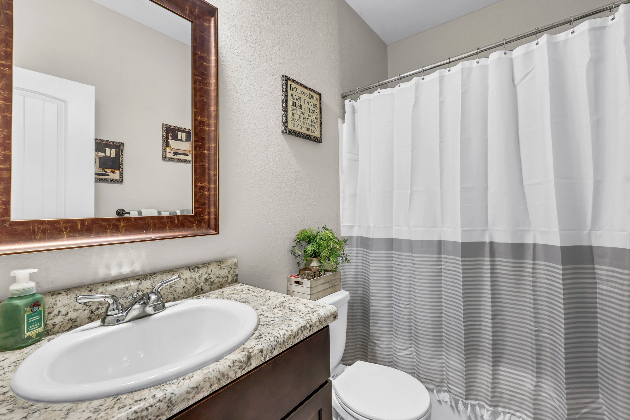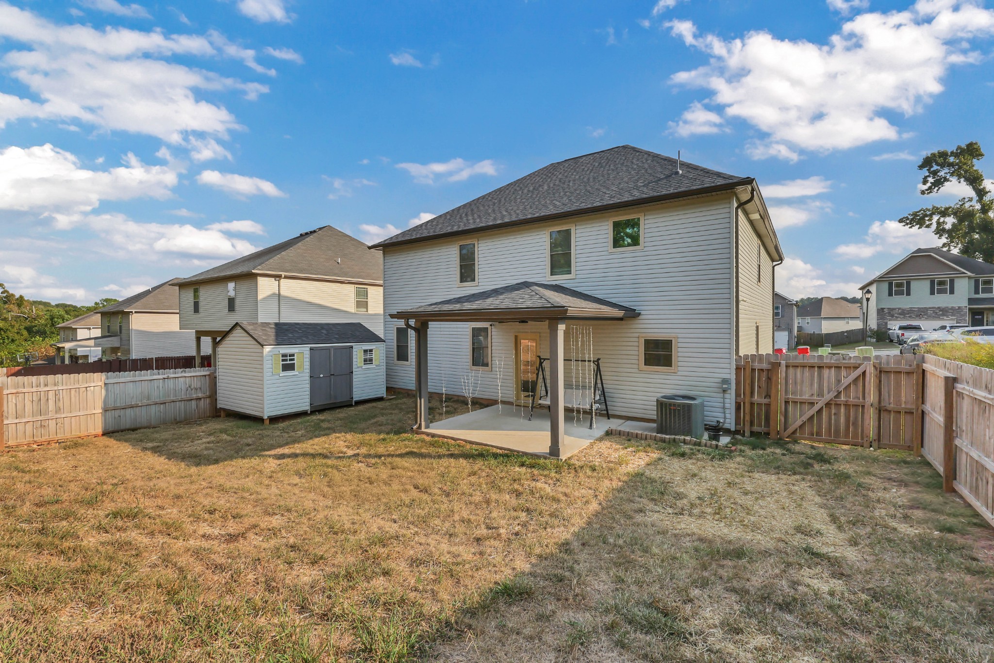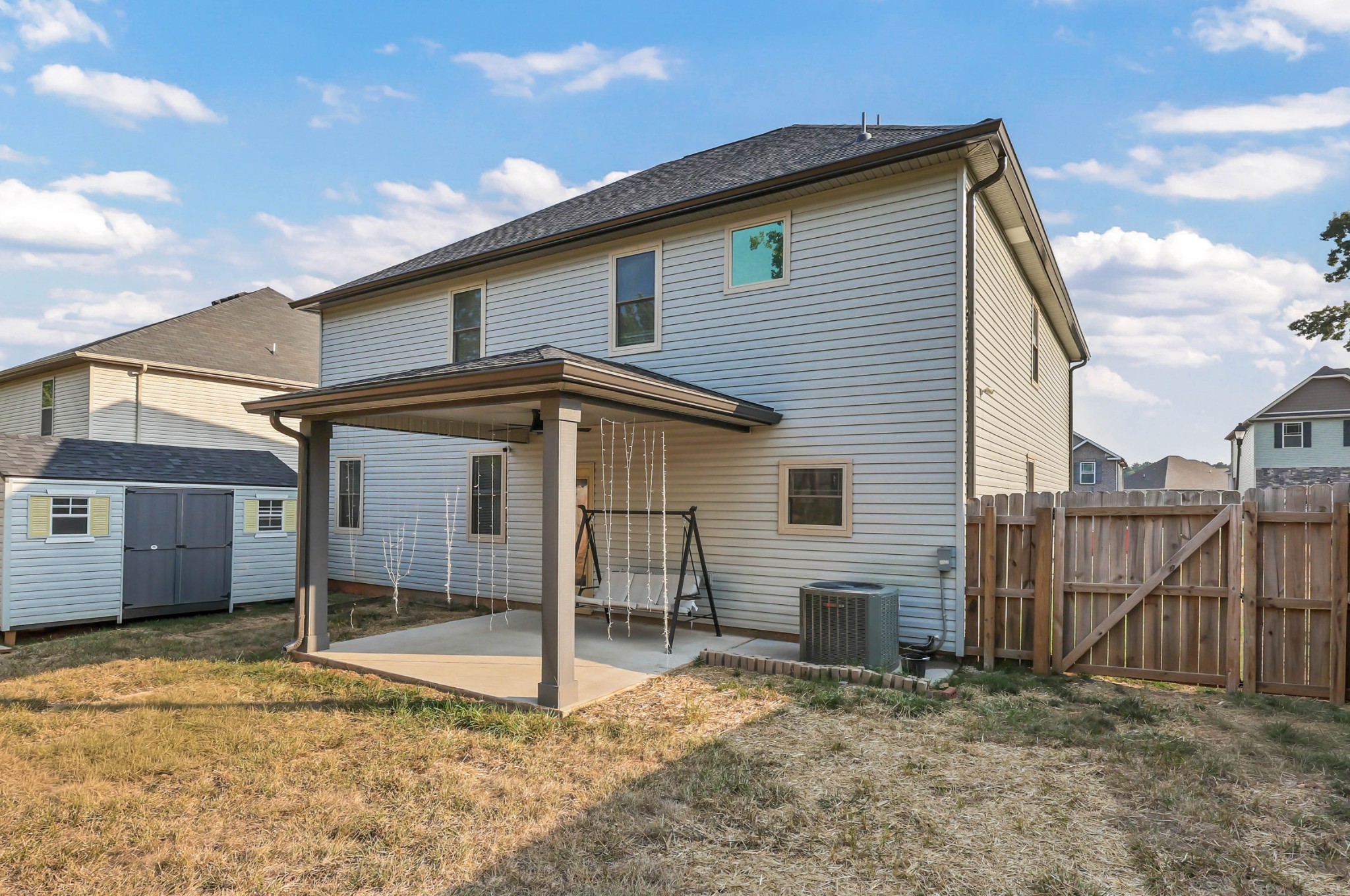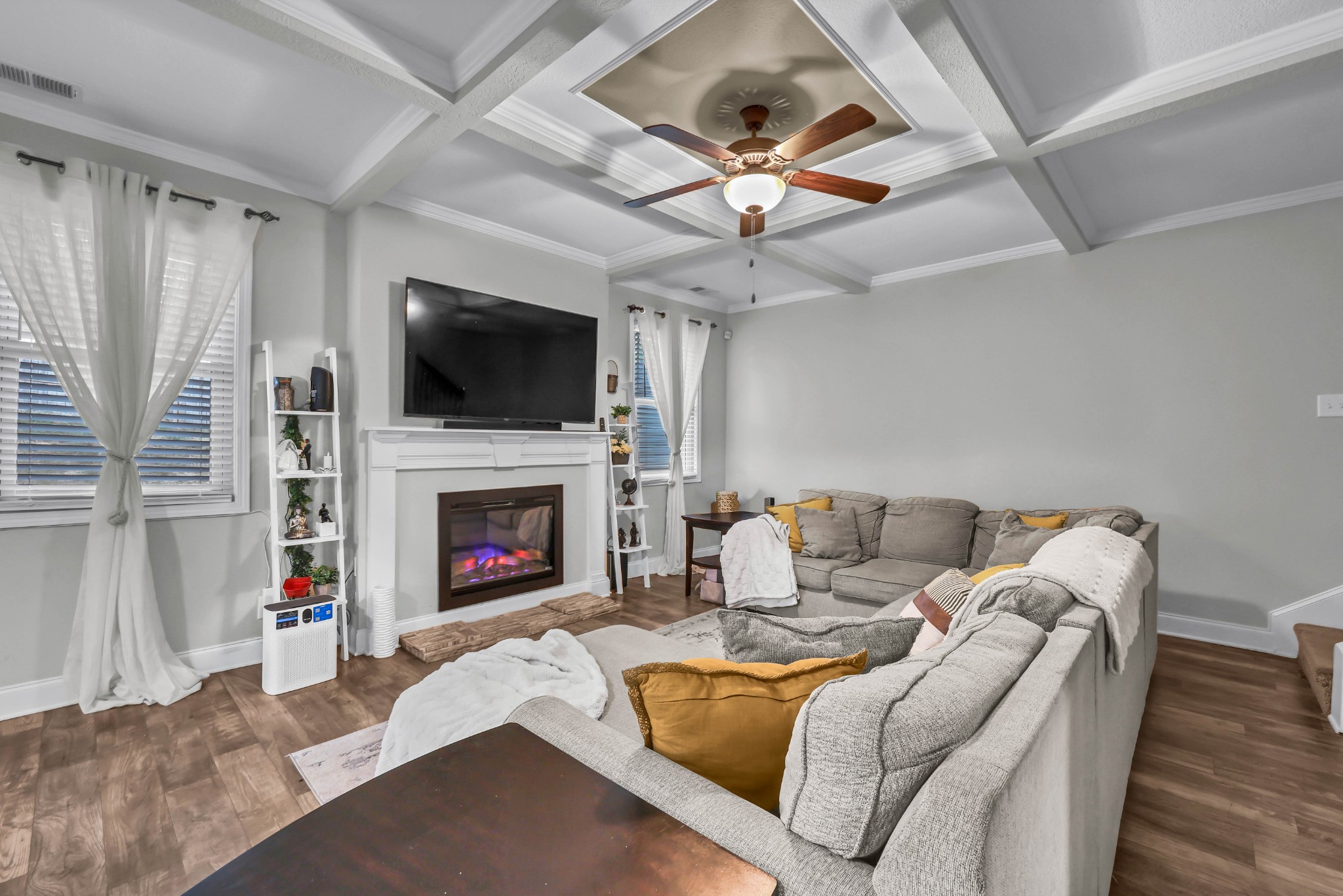 Spacious and beautifully maintained 5- bedroom, 3- bath home in West Creek Farms. This open- concept layout features elegant coffered ceilings, crown molding, wainscoting, and durable wood- look flooring throughout the main areas. The chef’s kitchen includes granite countertops, a 7- ft island, stainless steel appliances, and a walk- in pantry, flowing into a cozy living room with fireplace. A formal dining room adds sophistication, and a main- level bedroom sits near a full bath—ideal for guests or a home office. Upstairs, the expansive owner’s suite offers a private sitting room, two walk- in closets, and a spa- like bath with soaking tub and tiled shower. Enjoy a covered back patio, a fully privacy- fenced yard, and a large storage shed for added convenience. Schedule your tour today and see why this home stands out in West Creek Farms!